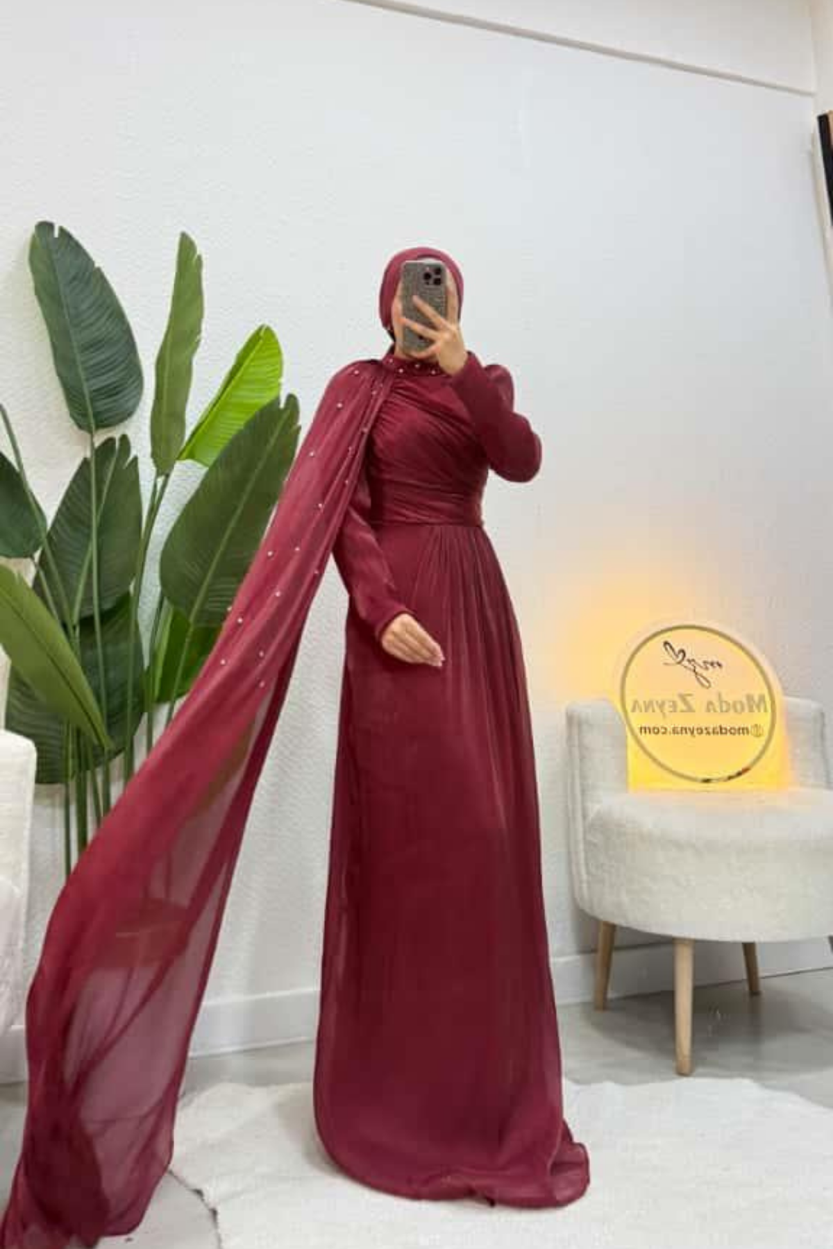 Zarafetin en güçlü hali… Sofya kumaşın akışkan ve tok duruşu, bordo tonunun asil enerjisiyle birleşerek göz alıcı bir siluet sunar. Sol omuzdan dökülen pelerin detayı ve ince taş işlemeleri, tasarıma haute couture bir karakter kazandırır.